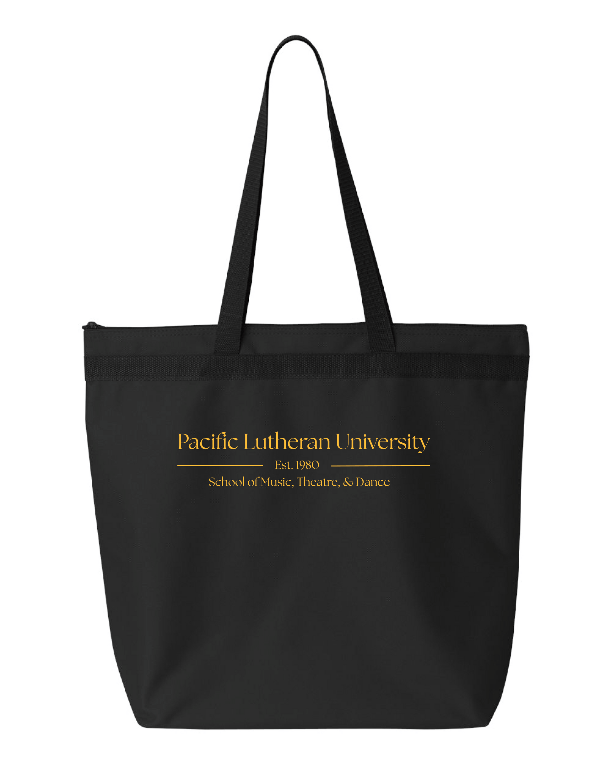 The open tote bag is 15"W x 16"H x 3"D and fits a music folder and other things comfortably.